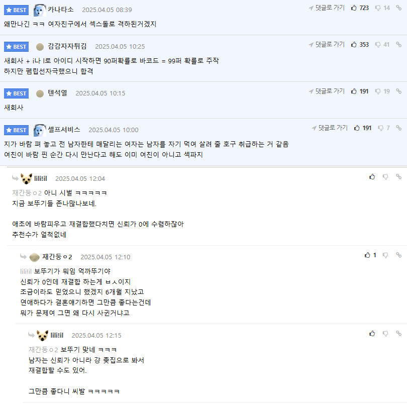 바람 핀 여친 용서해줘서 다시 만나고 있는데 user 4월 7, 2025 당겨주세요! 당겨주세요! 당겨주세요! About Author user 글쓴이의 글 보기 Post Views: 3,962 Post navigation Previous: 편순이인데 30대 민증 검사하면 도대체Next: 순수하게 밥 한번 먹자는 교수님