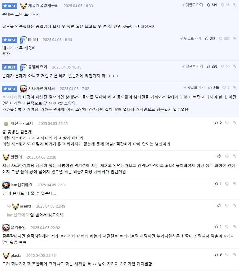 순대국 때문에 파혼했다는 여자 user 4월 9, 2025 당겨주세요! 당겨주세요! 당겨주세요! About Author user 글쓴이의 글 보기 Post Views: 2,002 Post navigation Previous: 당근마켓 유부남의 요청사항Next: 육각형인데 결혼이 힘들다는 고민녀