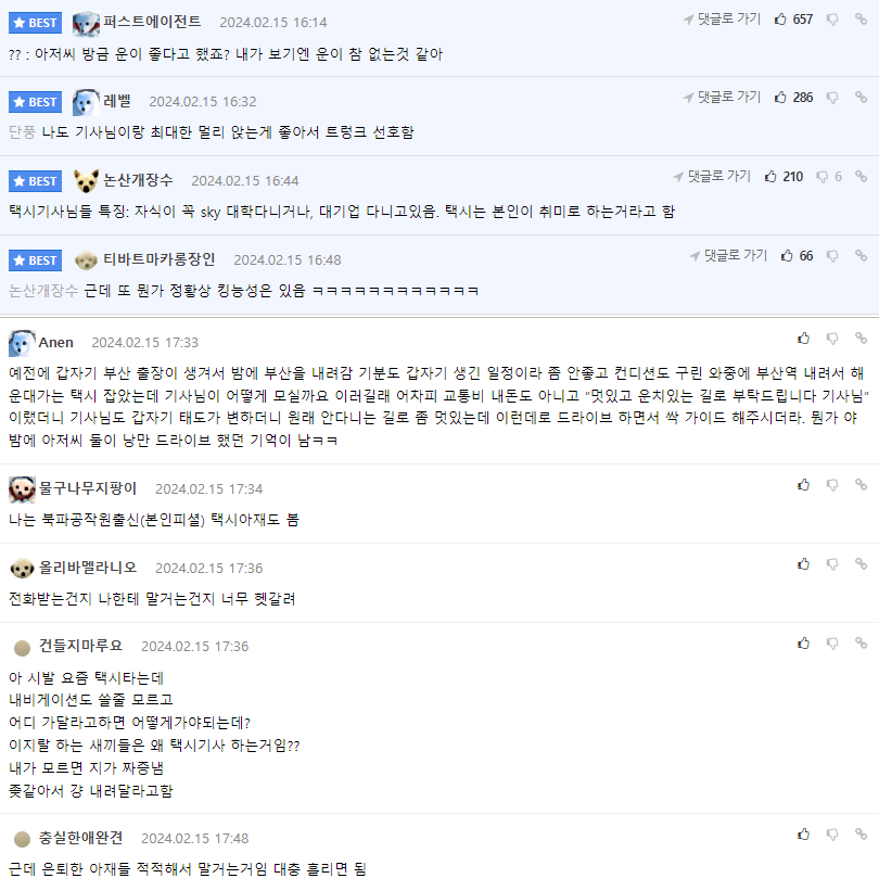 묘하게 킹받는 택시기사님 화법 특 user 2월 22, 2024 당겨주세요! 당겨주세요! 당겨주세요! About Author user 글쓴이의 글 보기 Post Views: 1,247 Post navigation Previous: 손님한테 재수 없으니 오지 말라고 한 카페 사장Next: 강남 신축아파트 사우나 근황