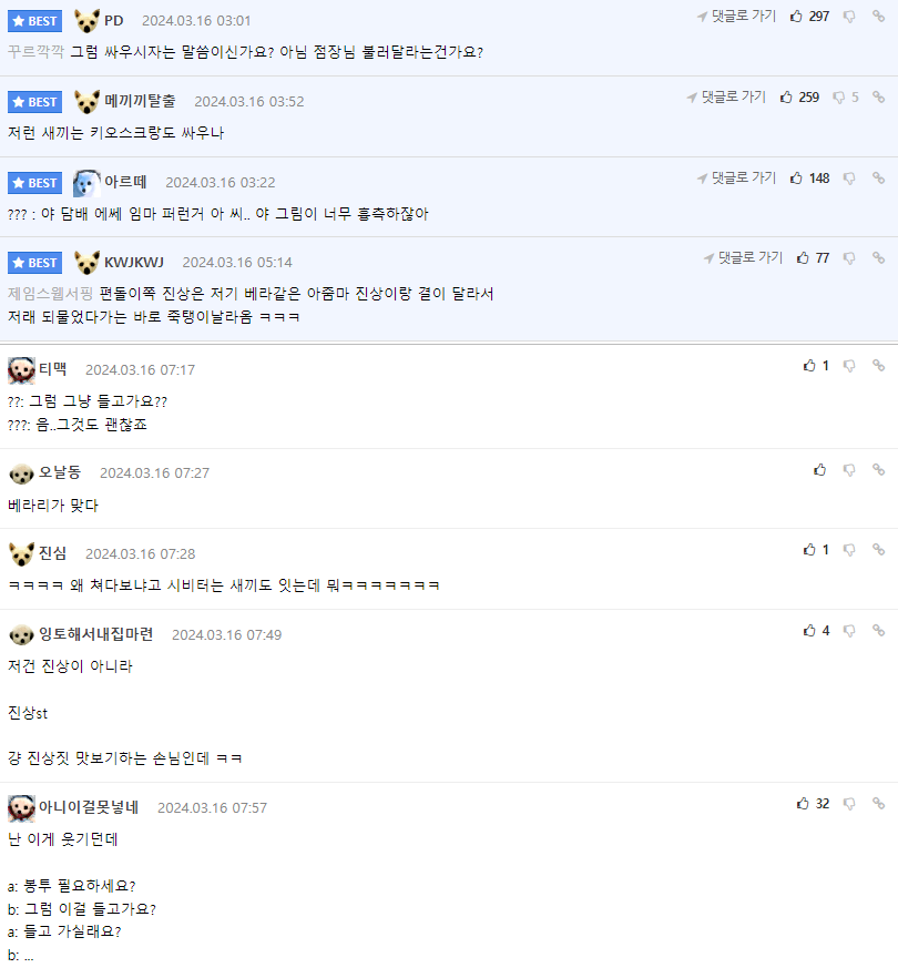 베라 신입 알바vs 진상손님 user 3월 29, 2024 당겨주세요! 당겨주세요! 당겨주세요! About Author user 글쓴이의 글 보기 Post Views: 11,442 Post navigation Previous: 신입한테 저격 당한거 맞지?Next: 녹색 어머니회 근황…