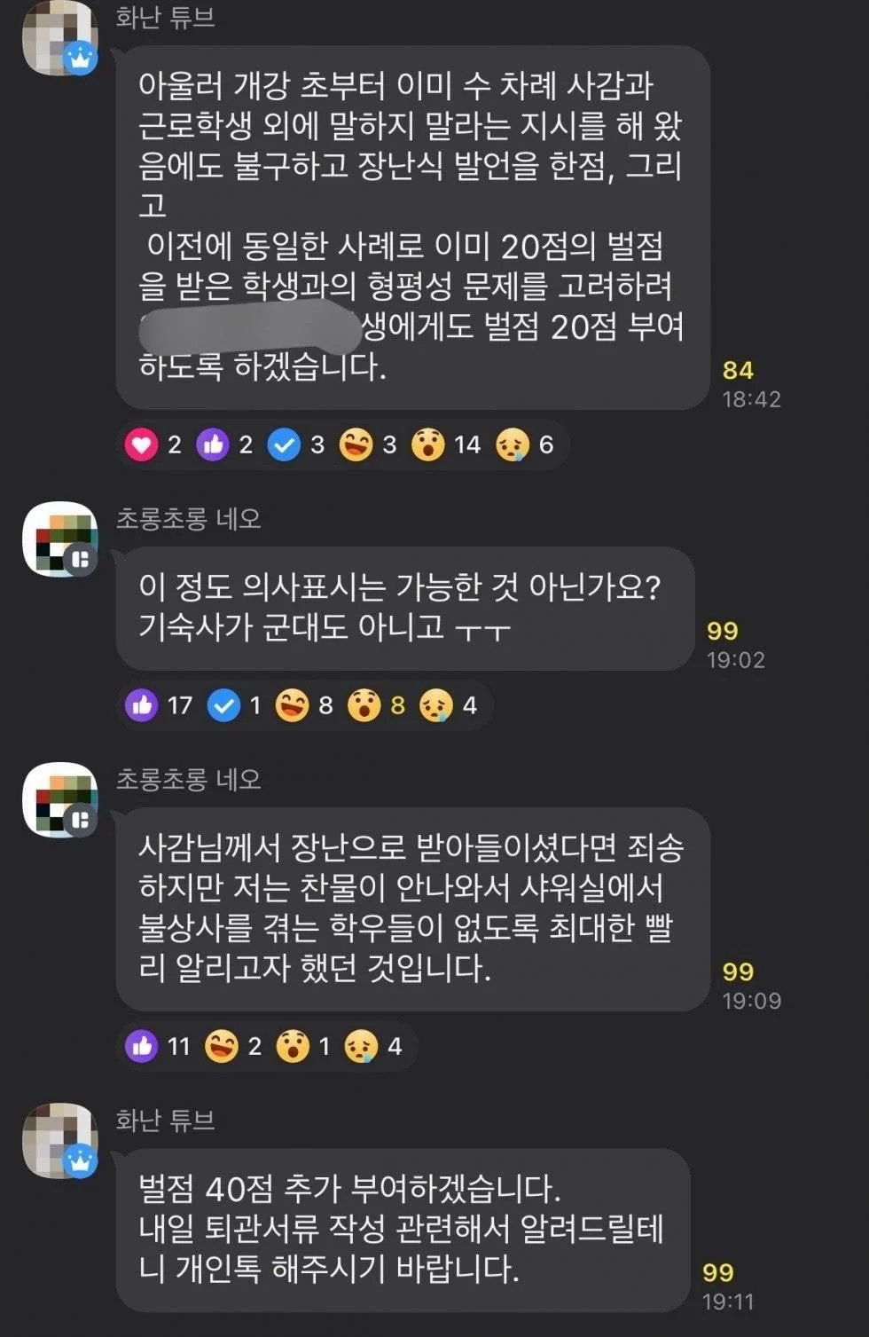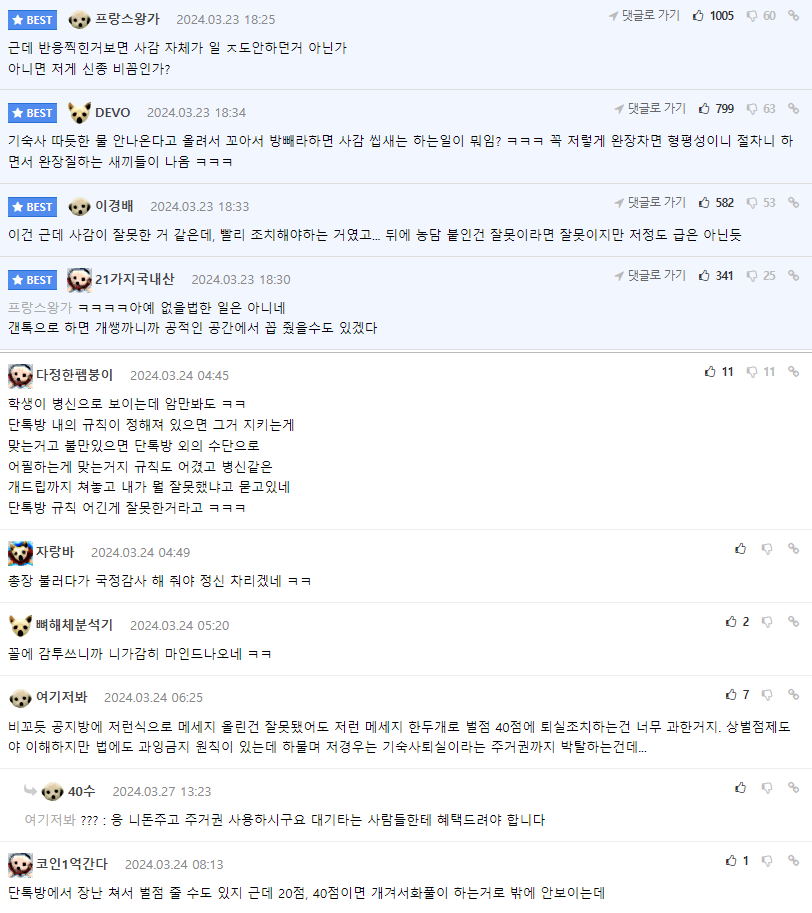학교 기숙사 공지용 단톡방에서 채팅쳤다가 퇴실 당한 학생 user 4월 4, 2024 당겨주세요! 당겨주세요! 당겨주세요! 당겨주세요! 당겨주세요! 당겨주세요! About Author user 글쓴이의 글 보기 Post Views: 19,140 Post navigation Previous: 김치도 안주는 설렁탕집은 처음Next: 고속버스 탓는데 기사님이 스벅사주셨어 ㅜ